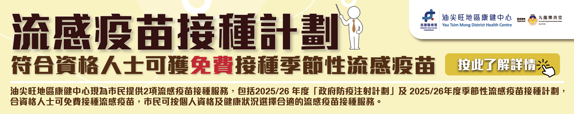 首頁sam2025-12-16T17:51:58+08:00 關於我們 油尖旺地區康健中心於2025年10月27日正式投入服務。中心以設於旺角廣東道1047號的主中心為核心,並於首年內於區內增設3個附屬中心,提升市民使用服務的便利性。中心將配備復康設施及視聽評估室,並優化健康教育設施。同時,中心會作為地區醫療健康資源樞紐,連結不同界別的公私營醫療及社區服務機構,協調基層醫療服務,為市民提供更全面和持續的健康支援。 服務理念 了解更多 網絡服務提供者 及 資源 了解更多 活動 了解更多 成為團隊夥伴 了解更多