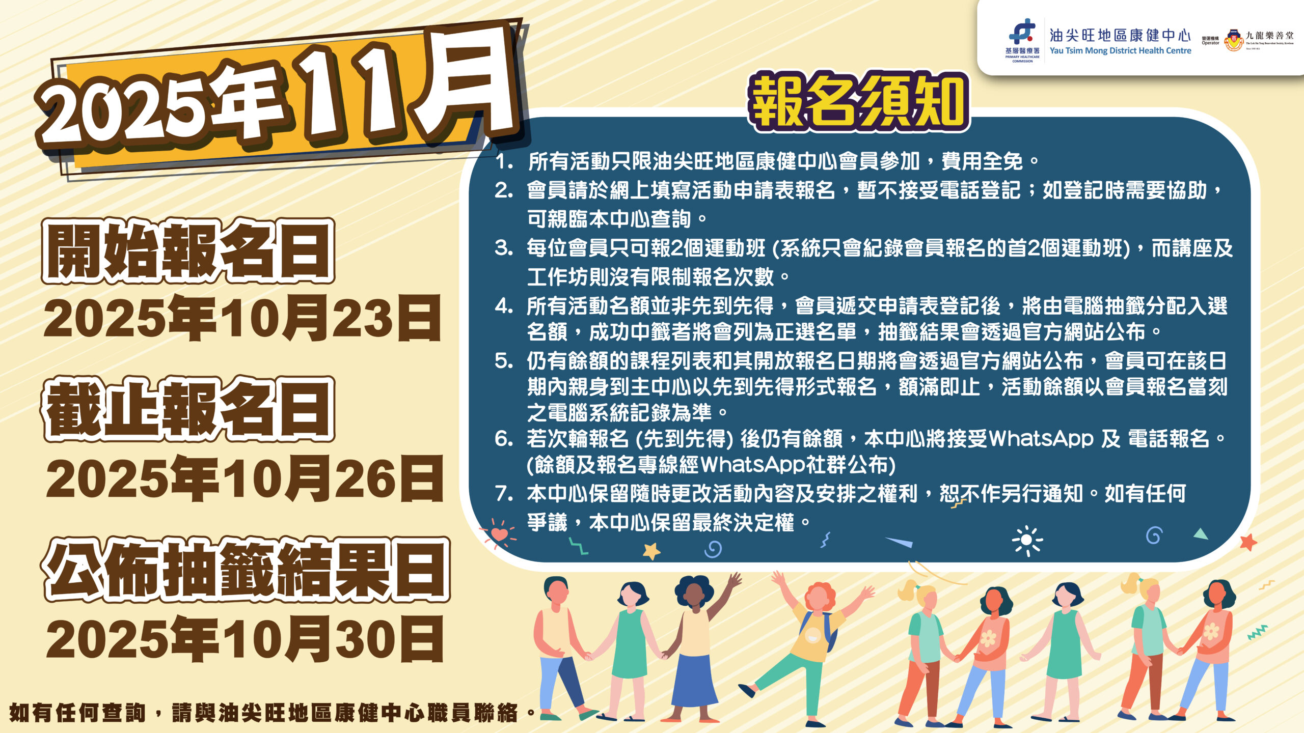 講座/工作坊:健康尖子大使培訓課程 (有興趣成為油尖旺地區康健中心義工的會員)(共2節:18/11, 25/11/2025)