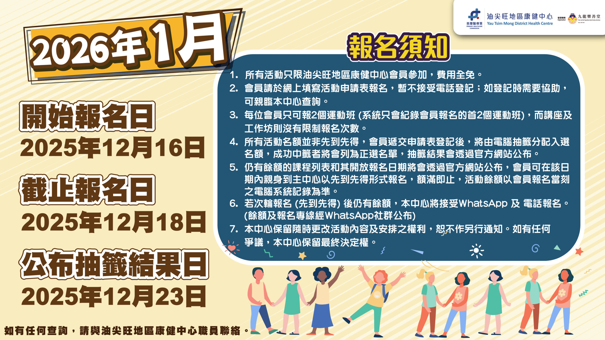📢部分活動尚餘名單將於稍後公布,歡迎有興趣之會員於2025年12月29日(星期一)上午10:00起,親臨主中心地下(地點:旺角廣東道1047號)報名。