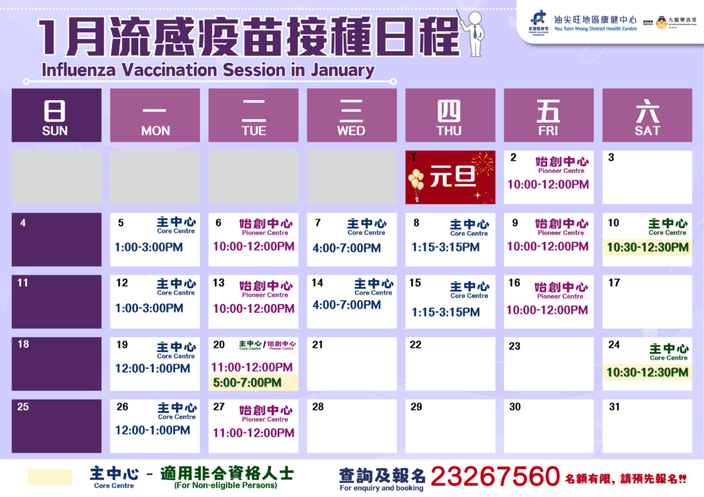油尖旺地區康健中心現為市民提供2項流感疫苗接種服務,包括2025/26 年度「政府防疫注射計劃」 及 2025/26年度季節性流感疫苗接種計劃,合資格人士可免費接種流感疫苗,市民可按個人資格及健康狀況選擇合適的流感疫苗接種服務,詳情請細閱下列資料: